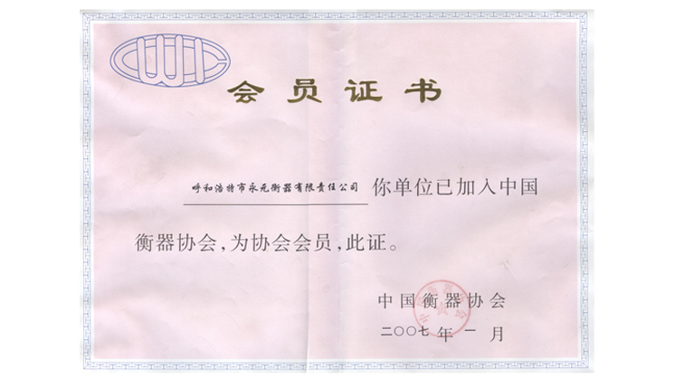 中國衡器協(xié)會會員證書